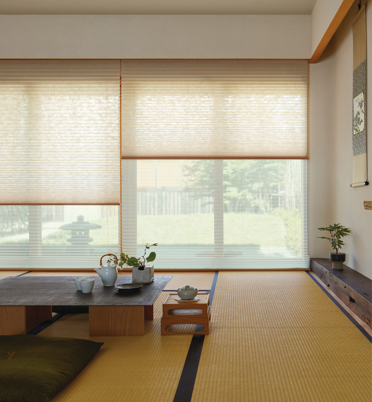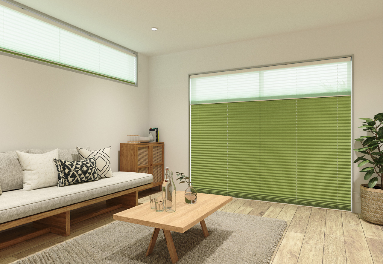 ニチベイプリーツスクリーン「もなみ」のツインスタイルの標準組み合わせシースルー生地として、さまざまな生地と調和します。