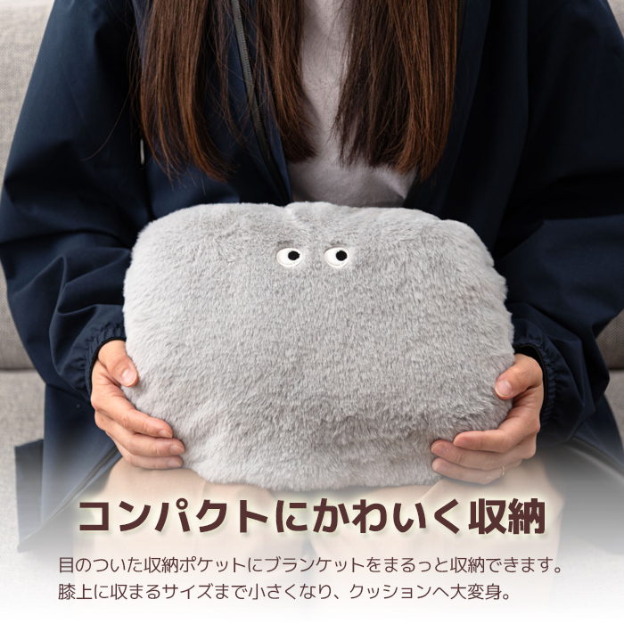 コンパクトにかわいく収納 目のついた収納ポケットにブランケットをまるっと収納できます。膝上に収まるサイズまで小さくなり、クッションへ大変身。 |