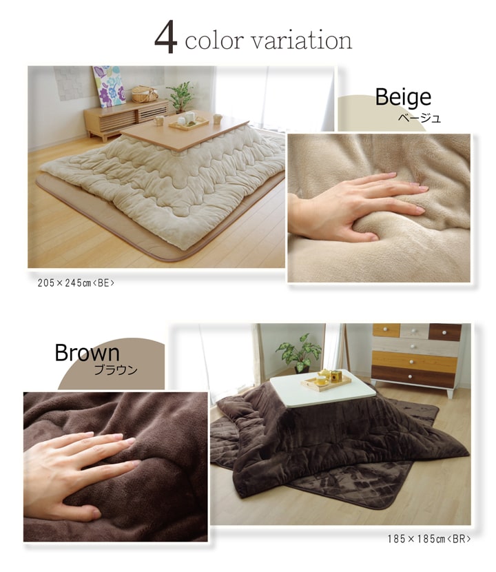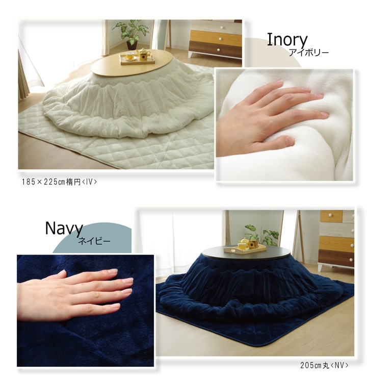 | 中わたに抗菌防臭加工を施した無地のこたつ布団です。側地には柔らかく、肌触りの良いフランネル生地を使用してます。毛足が短いので掃除機もかけやすく、毛足にゴミや埃が絡みにくいという特長もあります。両面使用可能なリバーシブルタイプです。また、表地の素材が同じで同色のキルトラグも別途取扱いがありますので、トータルでのコーディネートもおすすめです。こたつの特長として1.省エネルギー、こたつは必要なところだけを暖める省エネルギー暖房器具です。2.クリーン、こたつは二酸化炭素など有害物質を出さないのでクリーンです。3.団らんの場、家族や友達が一緒にくつろげる空間、心も体もポッカポカになります。※本商品は圧縮梱包でのお届けとなります。商品が届きましたらお早めに開梱して頂き、2~3時間日陰干しをして頂くと復元が早まります。 |