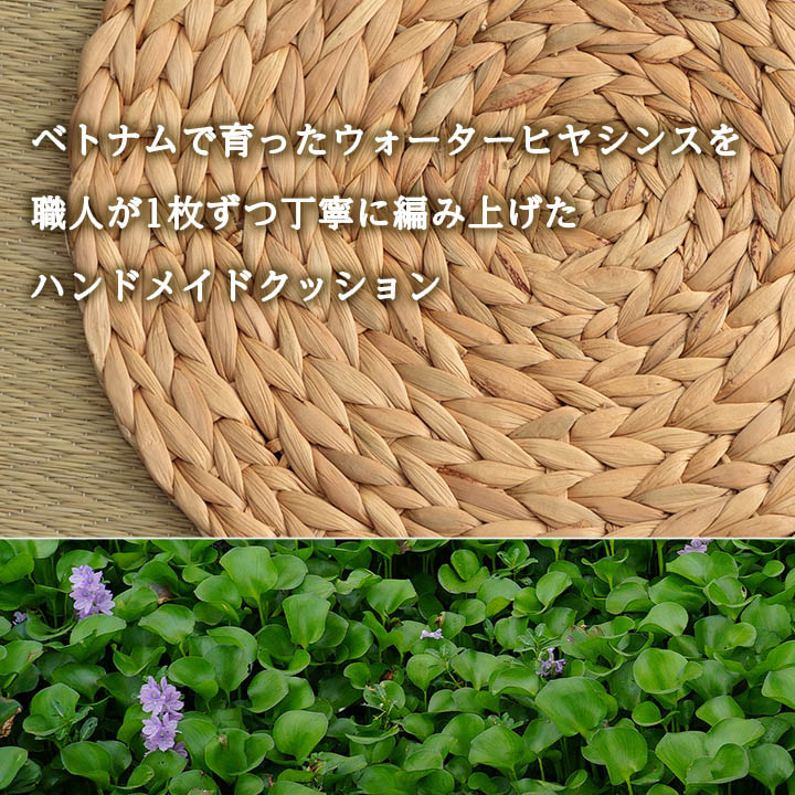 | ■ベトナムで育ったウォーターヒヤシンスを職人が1枚1枚丁寧に編み上げたハンドメイドクッションです。 ■べたつく夏でもさらっとした肌触りで、快適にお過ごしいただけます。 ■置くだけで雰囲気が出るので、リビングや飲食店にも最適です。 ※天然素材のため、小さな傷や色ムラが生じます。また、素材の端が飛び出しているため、ストッキングなどほつれやすい衣類との接触にご注意ください。爪切りなどで丁寧に切ってご対応ください。 ※手作りのため、色合いやサイズに個体差がございます。 ※上記の理由による返品・交換は承りかねます。ご了承の上、お買い求めください。 |