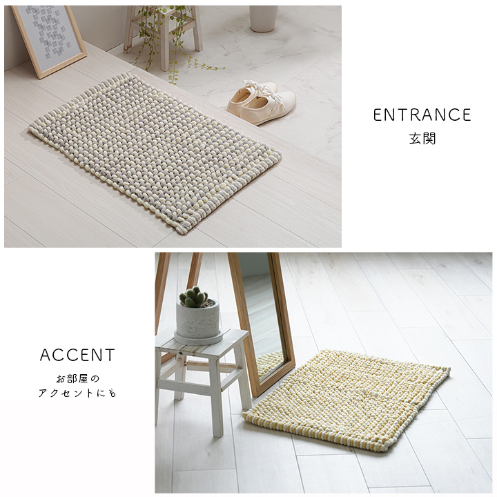 | "吸水性のあるマイクロファイバーとインド産の綿を1枚ずつ丁寧に織り上げた手織りのマットです。 大きめのパイルで、ぽこぽこと気持ちのいい踏み心地に仕上げました。 しっかりとしたボリュームで素材感もたっぷりな商品です。 500mlペットボトル約6.6本分(約3.3L)の吸水力 バスマット・キッチンの水回りなど様々な場所でお使いいただけます。 玄関マットやアクセントマットとしてのご使用もおすすめです。 |