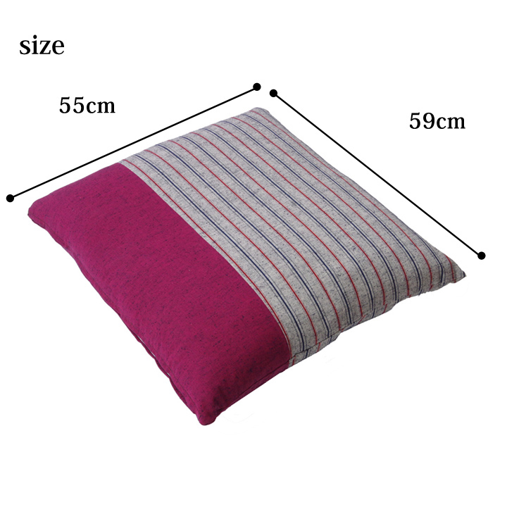 | 銘仙判サイズ(約55×59cm)の布団です。綿100%を使用した側地は洗濯機でも洗うことができお手入れも簡単です。国内綿入れ加工をしているためふっくらとしたほどよいクッション性があります。和洋どちらにも使用できる商品です。 |