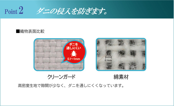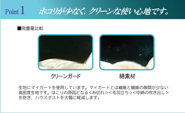 | 生地にマイガードを使用しています。マイガードは繊維と繊維の隙間が少ない高密度生地なので、ほこりの原因となる糸切れ、毛羽立ち、中綿の吹き出しを防ぎハウスダストを大幅に低減します。またダニの侵入を防ぎ、クリーンで快適な睡眠をサポートします。 |