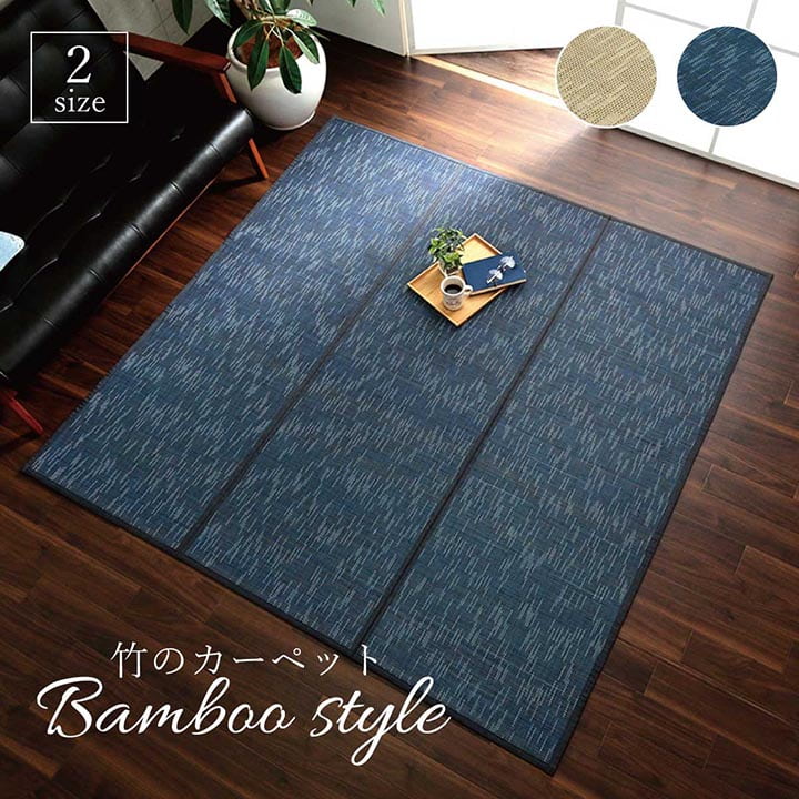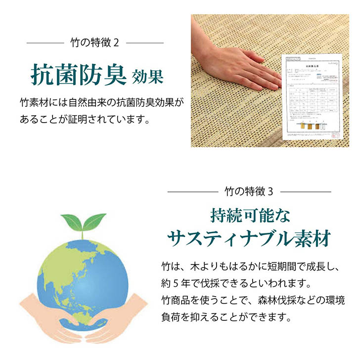 | シンプルなデザインで年間使用しやすいバンブーラグです。縦糸にカラー糸を使用し飽きの来ない無地調のデザインが特徴です。竹には抗菌防臭効果・消臭効果・防汚効果があり、清潔な状態を保てます。耐久性に優れており、ペットのいるご家庭にもオススメです。竹は他の木材と比べると格段に成長が早く(3~5年で成竹)、持続的生産が可能な環境に優しいサスティナブルな素材です。コンパクトに畳めるため収納も可能です。裏面は不織布で床を傷つけません。 中材にはウレタンフォーム3mmを使用し、底つき感を軽減しています。 |