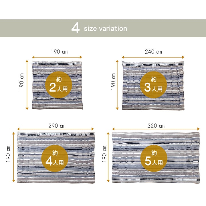 | "家族みんなで使用できるファミリー掛け布団です。 小さなお子様がいらっしゃる方、家族みんなで川の字になって寝たい方におすすめです。ゆっくりと横になり家族だんらんの時間をお過ごしください。 肌にあたる部分にはあったかい素材のフランネルを使用しています。 ", |