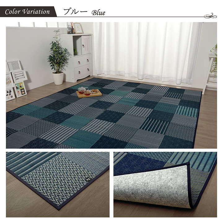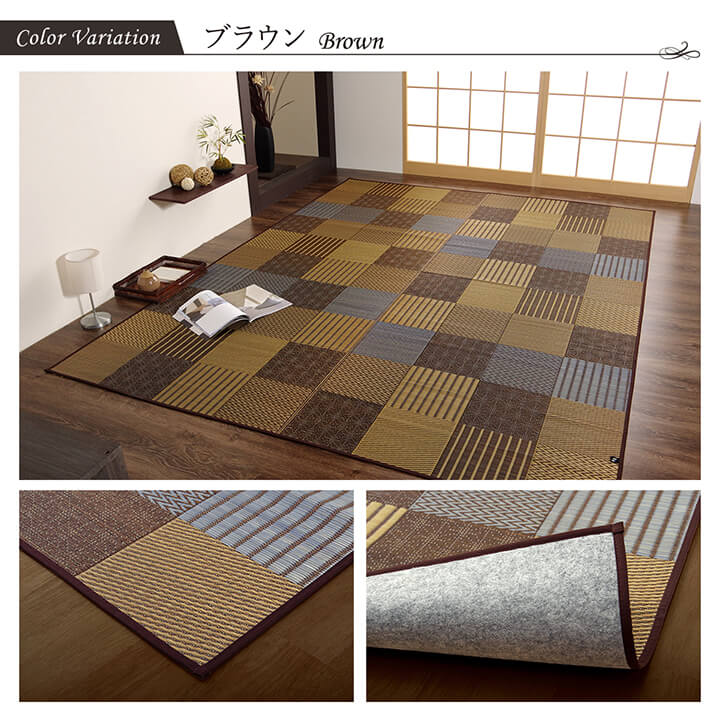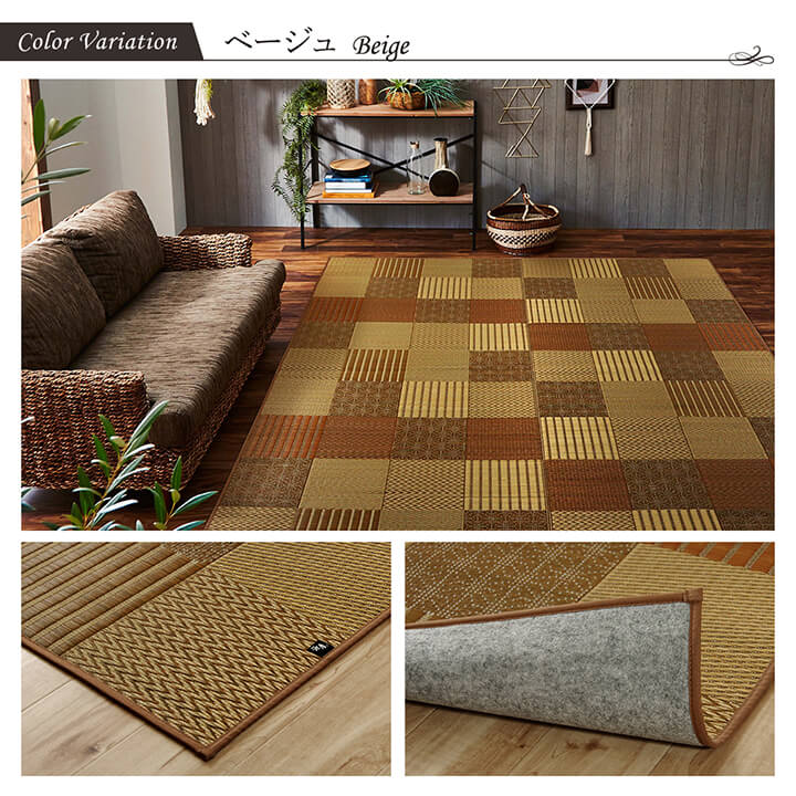 | いろいろな織りを組み合わせたパッチワーク風のい草カーペットです。織り方によって違う複数の肌感触をお楽しみ頂けます。落ち着いた色目でモダンな雰囲気に仕上げました。縦糸の本数が多い袋織りという技法で繊細な柄を出しています。折れ曲がりが複雑なので長いイ草を使用しないと切れてしまいます。縦糸が密なので、しっかりとして破れにくいのが特徴です。国産(九州産)のい草を使用しています。一本一本が太く、表皮が厚く繊維がキメ細かいので弾力性があり、耐久性に優れています。い草には空気の自然浄化作用、湿度の調節作用などがあります。また汚れにくく、使用するうちに黄金色に変化し味が出ます。裏には不織布を貼っていますので、フローリングでのご使用にも適しています。い草に青森ヒバ加工を施しています。(抗菌、防臭効果) |