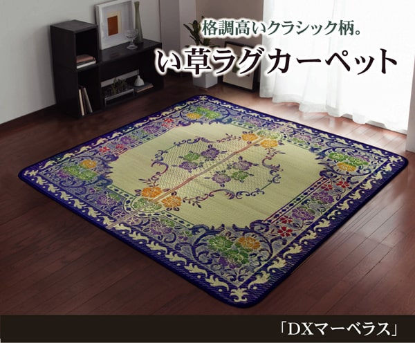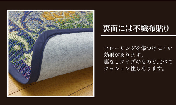 | まるで絨毯のようなデザインを施したい草ラグです。い草には空気の自然浄化作用、湿度の調節作用などがあります。また汚れにくく、使用するうちに黄金色に変化し味が出ます。い草に青森ヒバ加工を施しています。(抗菌、防臭効果)フローリングを傷つけにくいよう、裏には不織布を貼っています。 |