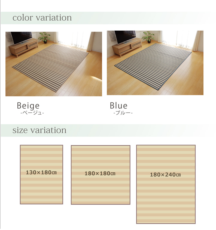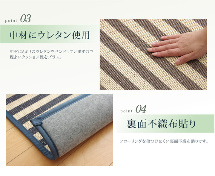| マリンテイストのバンブーラグです。竹の素材感を残しながら、カラー糸によりデザインを表現しています。さらっとした足触りと裏面に不織布を使用しているため底付き感を軽減してくれます。フローリングにもぴったりの商品です。竹は耐久性に優れ、熱伝導率が高いため自然のひんやり感があります。 |