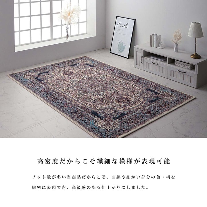| "エジプト製のウィルトン織りカーペットで、非常に耐久性の高いカーペットです。 本商品の『繊維の密度を表すノット数』は1,200,000ノットで、プリントものには出せない高級感・重厚感のある繊細な柄をお楽しみ下さい。 本商品のパイル部分にはポリプロピレン素材を使用しており、汚れが付着しにくく、遊び毛や毛玉が非常に出にくいという特徴もあります。 本商品にはヒートセット加工を施しており、柔らかく、なめらかなタッチ感に仕上げました。 |