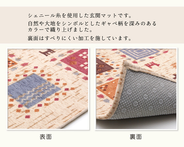 | シェニール糸を使用した玄関マットです。シンプルなギャベ柄をあしらい、玄関をぱっと明るく演出してくれます。裏面にはすべりにくい加工を施しています。 |
