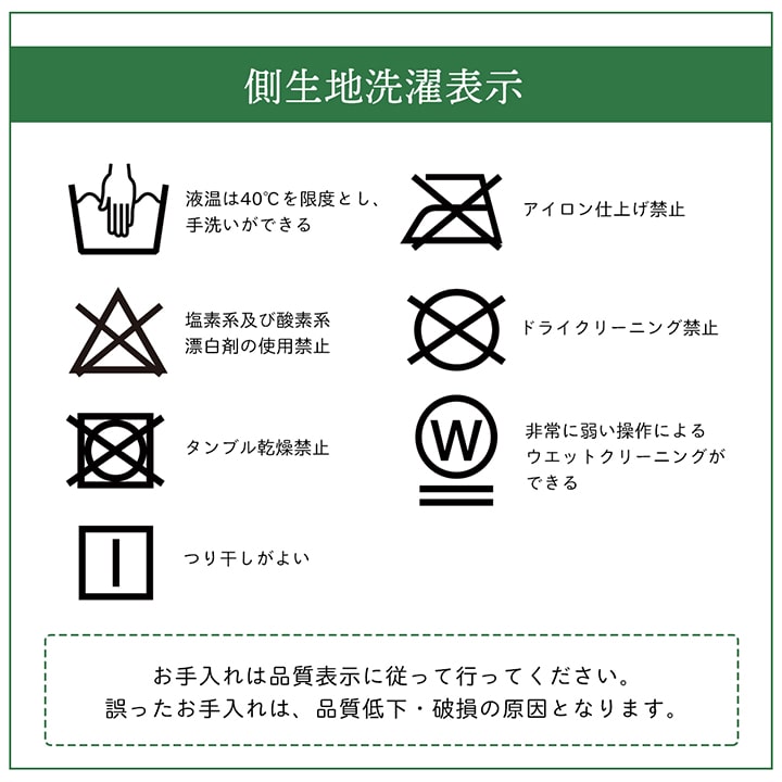 | 40℃以下の水温で弱い手洗いで洗濯してください。(洗濯機は使用できません。) 干し方=日陰のつり干しがよい。 |