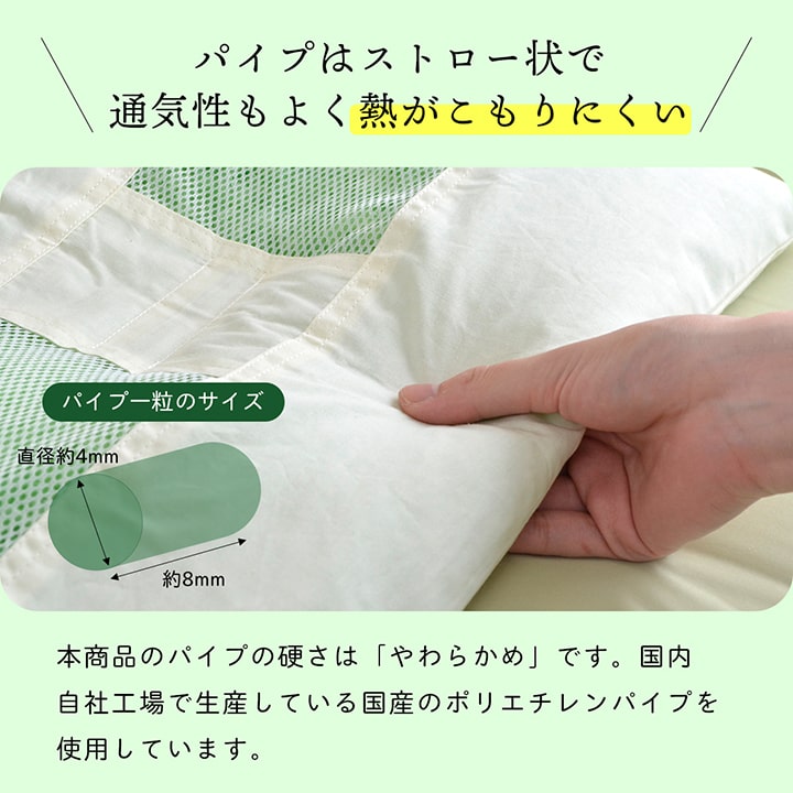 | ヒバエッセンス練り込みパイプを使用しています。青森県のヒバの木から抽出した「ヒバエッセンス」をメーカー独自の技術でパイプに加工しました。ヒバエッセンスにはヒノキチオールという、天然物質では極めて抗菌性の高い成分が含まれています。(無加工品に比べ、抗菌・防臭効果があります。)ヒバエッセンスで安らかな森の眠りをご提案します。パイプ使用のため、通気性がよく、熱がこもらず心地よくご使用できます。ファスナー式で中材(パイプ)の交換、高さ(量)の調節が可能です。ご家庭で簡単にパイプが洗えます。 |