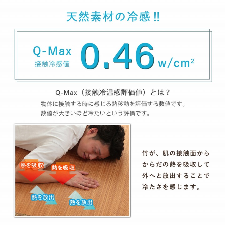 | 素材は皮下2.6mm竹ヒゴを使用しています。汚れにくく、耐久性に優れ、熱伝導率が高いため、ひんやり感も抜群です。竹表面をプレスしているので高さが揃っており、つるつるとした肌触りです。竹は他の木材と比べると格段に成長が早く(3~5年で成竹)、持続的生産が可能な環境に優しいサスティナブルな素材です。 |