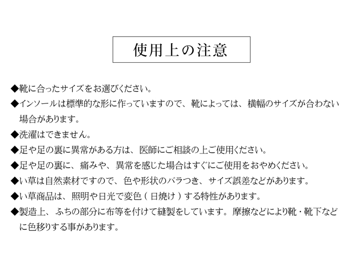 | い草を使用したインソールです。い草の消臭効果・湿度調整機能で、蒸れを抑え、臭いを消臭する効果があります。革靴やスニーカーなどにもおすすめです。サイズは22cmから27cmまでご用意しています。 |