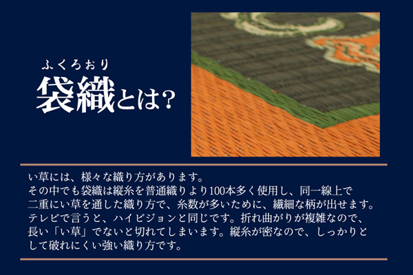 | 縦糸の本数が多い袋織りという技法で繊細な柄を出しています。折れ曲がりが複雑なので長いイ草を使用しないと切れてしまいます。縦糸が密なので、しっかりとして破れにくいのが特徴です。さらに五重に織ることで耐久性、ボリューム感、圧倒的な存在感のある商品に仕上げました。通常の敷物は二重織りで一直線上に2色しか色を出せないのに対し、5重織りは5色の色出せますのでより鮮やかで繊細な柄を出すことが出来ます。たて糸は通常の国産の敷物に使用される約1.3倍の太さの糸を使用している為、糸自体の耐久性に優れ、生地表面の目立ちもハッキリとしています。ヘリ生地は久留米織りの生地を使用しています。久留米織りとは福岡県久留米地方の伝統的な織り物で、着物や洋服によく使われている貴重な織り物です。五重織りの商品を仕上げるのには特に熟練された技術が必要で、限られた職人さんでしか織りあげることが出来ません。また一日に約6~7枚しか生産が出来ない希少価値のある商品です。国産(九州産)のい草を使用しています。一本一本が太く、表皮が厚く繊維がキメ細かいので弾力性があり、耐久性に優れています。い草には空気の自然浄化作用、湿度の調節作用などがあります。また汚れにくく、使用するうちに黄金色に変化し味が出ます。い草に青森ヒバ加工を施しています。(抗菌、防臭効果)裏には不織布を貼っていますので適度なクッション性があり、フローリングでの使用にも適しています。 |