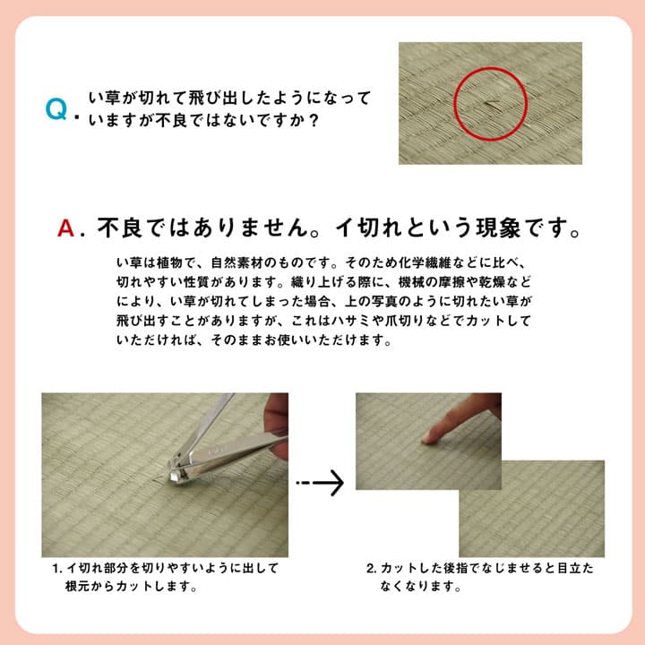 | 上敷きを敷くだけで畳のお部屋をリフレッシュ出来ます。日焼けしてしまった畳のリフレッシュに、新品の畳を汚さないためのカバーにご使用頂けます。天然素材のい草には、お部屋の空気をきれいにする空気清浄効果、お部屋の湿度を調整する調湿効果、汗臭、加齢臭、ペット臭などの嫌な臭いを消臭する消臭効果など優れた機能性があります。またこの商品には小林製薬社の持続性抗菌剤のKOBA-GUARDを使用し制菌、抗菌防臭効果もございます。長さ約100~105cmのい草を使用しています。そのうち約88cmを使用しています。い草は使用するうちに日焼けをしますが、商品使用上問題はございません。表裏の両面が使えて経済的です。 |