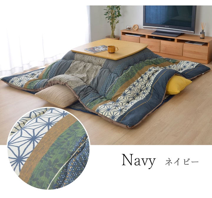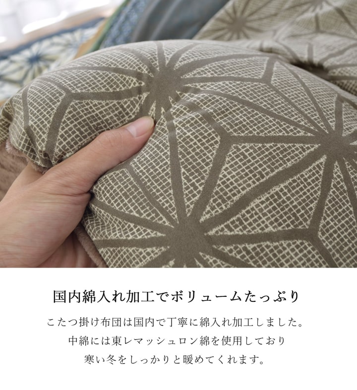 | やわらかな肌触りのピーチスキン加工を使用したこたつ布団です。優しい肌触りが特徴です。裏地にはあたたかく、ふんわりとなめらなタッチ感のフランネルを使用しています。部分暖房のこたつは電気代もお得です。 |