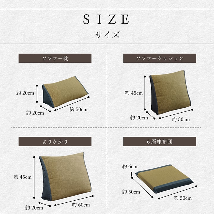 | さまざまな姿勢に適した形のバリエーションがあります。おうちでゆっくりくつろぐ際に活躍してくれます。い草には、空気をきれいにする、湿度を整える、高い吸湿性、消臭、汚れにくい、燃えにくい、森林浴効果などの効果があります。 |
