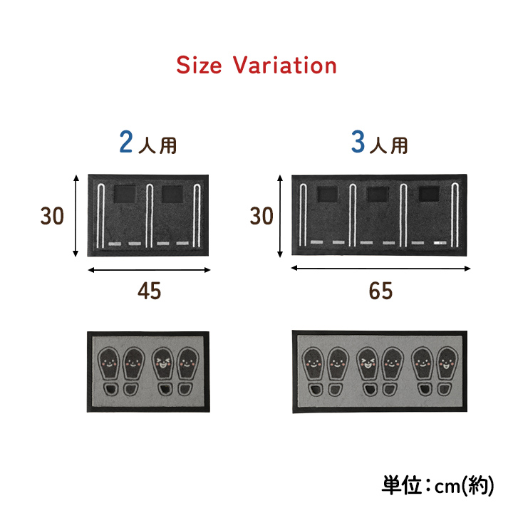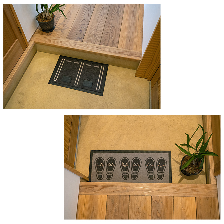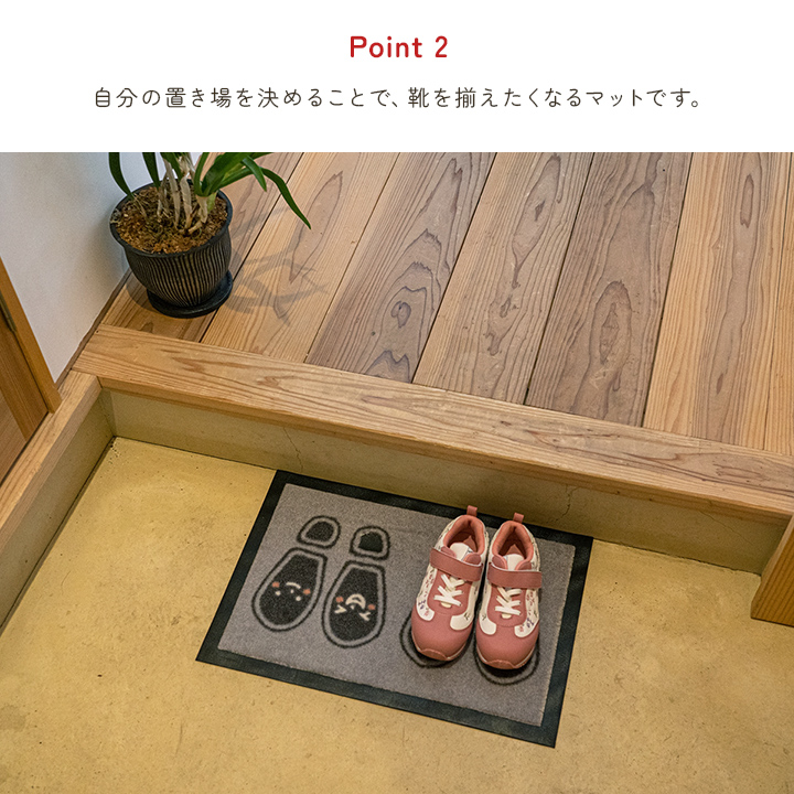 | お子様の靴揃え教育にぴったり! 自分の置き場を決めることで、靴を揃えたくなるマットです。 くりぬきゴム部分に白の油性ペンで名前や番号を書き込めます。 |