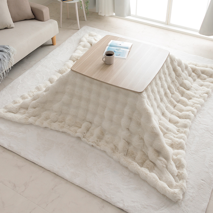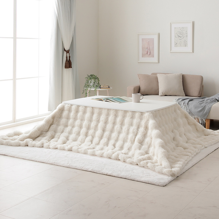 | """大人かわいい"シンプルデザインのラピアスシリーズに、プレミアムな触り心地のこたつ掛毛布が登場。 もこもことしたシルエットが可愛い、ラビットファー調のこたつ掛け毛布です。 当商品の生地を選定するにあたり、担当者が数種類の生地を実際に触り比べ、プレミアムの名に相応しい触り心地の生地を追及しました。 極細のフィラメント糸で、とろけるような触り心地です。 毛足の長さは25mmを採用しているので、一般的な毛布よりもふわふわの極上タッチをお楽しみいただけます。 表面はシリーズの中でも高目付です。ボリュームアップしたことでより贅沢な触り心地と、暖かさを実現しました。 中綿なしでも生地に重みがあり、暖かいのでブランケットとしてもお使いいただけます。 小さなお子様がいるご家庭でも安心な乳幼児基準値をクリア。お子様にも安心の低ホルムアルデヒド商品です。 キルトなしの2枚合わせこたつ掛け毛布なので、もこもこのデザインを崩さず可愛さをキープ。 裏面にはなめらかな肌触りのフランネル生地を使用しています。 自宅で手軽に洗濯ができるので、清潔さとふわふわのボリューム感をキープできます。 優れた技術と整備された施設で、徹底的な管理体制の元生産された安心の品質です。 オフシーズンには毛布をしまっておけるケース付きで、収納も困りません。 |