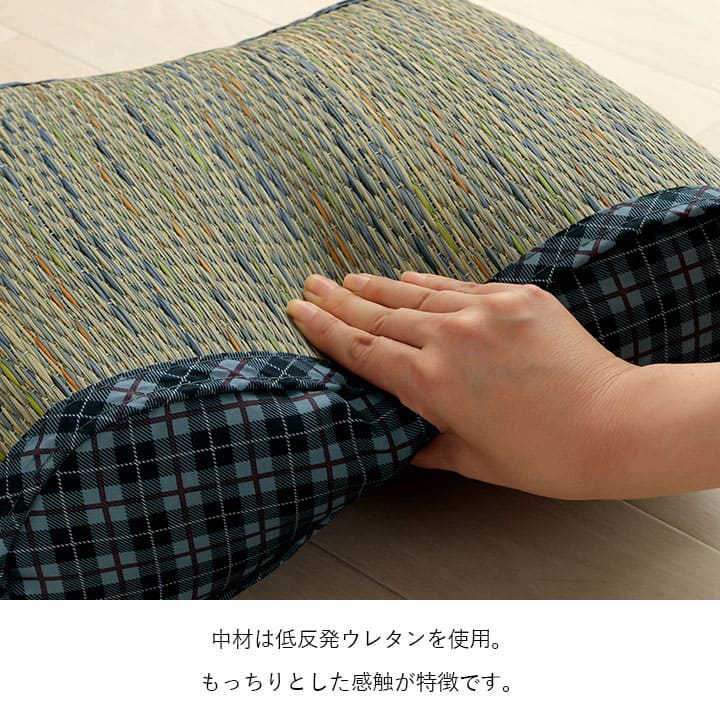 | "チェック柄のおしゃれない草のフィットクッション。腰当てやお昼寝用の枕、足枕など、いろんな使い方が出来ます。 中材は低反発ウレタンを使用。もっちりとした感触が特徴です。 い草の調湿効果で長時間座ってもムレにくく、快適にお過ごしいただけます。 快眠い草の効能として 1.綿の約2.5倍の吸湿力 2.蒸れにくい。汗による湿気を吸うことにより温度を下げ快適な就寝を促します。 3.汗のにおいを軽減。汗のにおいの元となる化学物質を90%以上抑えます。 などがあります。暑苦しい日本の夏でも汗のジメジメを軽減してくれます。 |