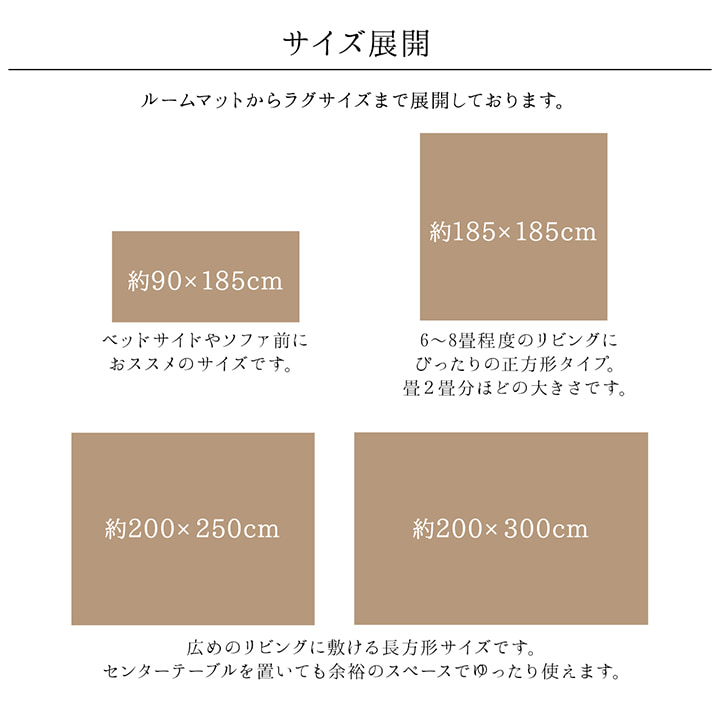 | 表地はなめらかタッチのフランネル素材を使用し、凹凸感を出すことでより触り心地が良いです。中材には低反発ウレタン15mmを使用しています。柔らかい感触とボリューム感をお楽しみください。裏地には滑り止めがついているので安心です。ホットカーペットカバーや床暖房の上でもご使用いただけるので、オールシーズン対応のラグです。ルームマットサイズからラグサイズまで展開しております。選べるカラー4色展開です。 |