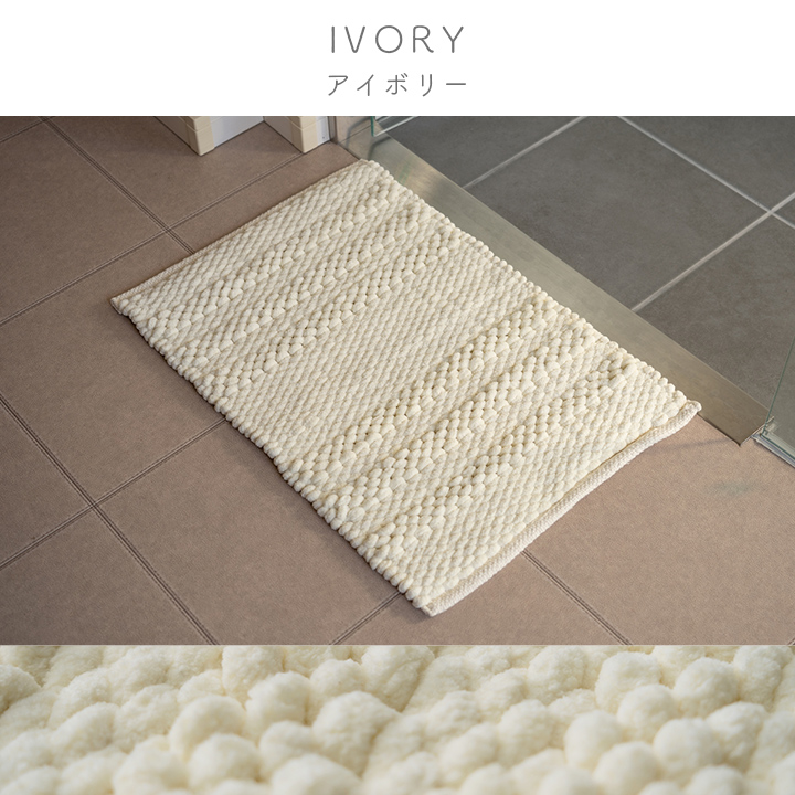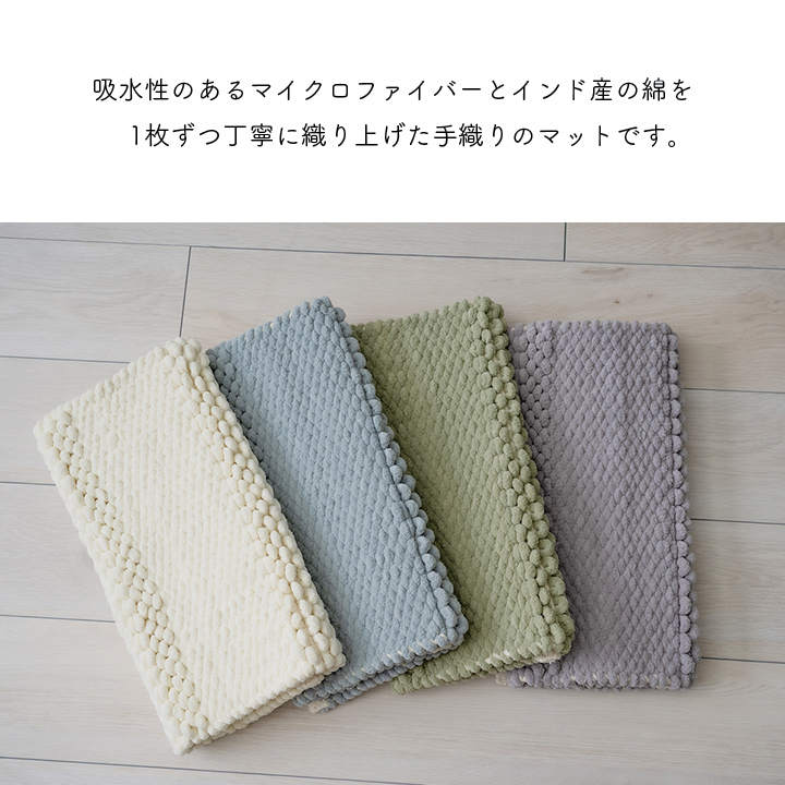 | "吸水性のあるマイクロファイバーとインド産の綿を1枚ずつ丁寧に織り上げた手織りのマットです。 パイルの織り方に変化をつけ、表面の凹凸感を表現しました。 しっかりとしたボリュームで素材感もたっぷりな商品です。 500mlペットボトル約5.4本分(約2.7L)の吸水力 バスマット・キッチンの水回りなど様々な場所でお使いいただけます。 玄関マットやアクセントマットとしてのご使用もおすすめです。 |