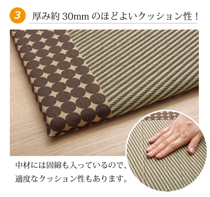 | 表地=い草(九州産)+ポリプロピレン 布部分=綿100% 中材=アレルプルーフ+ポリエステル100%【固わた】 |