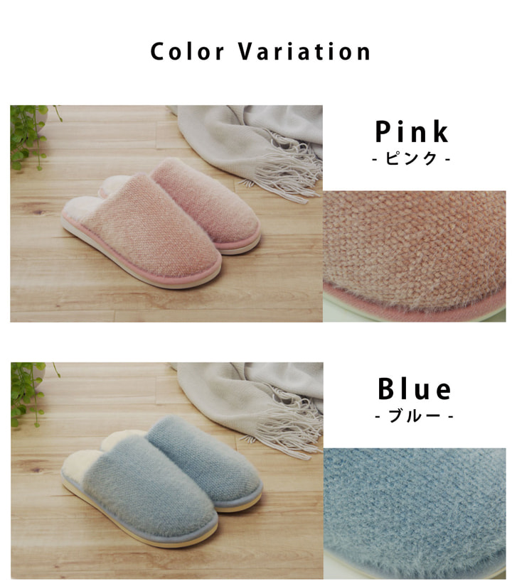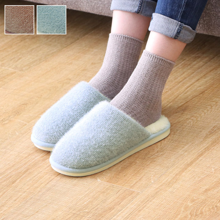 | ご自宅用・来客用・オフィス用など幅広くどんな場面でもご使用いただけます。プレゼントにもおすすめです。ぬくもりのある肌触りで素足で履くことも可能です。履いた時にフィットするので脱げにくく歩きやすいルームシューズです。裏側はPVC素材を使用しており、汚れた際は水拭きする事ができ、お手入れも簡単です。 |