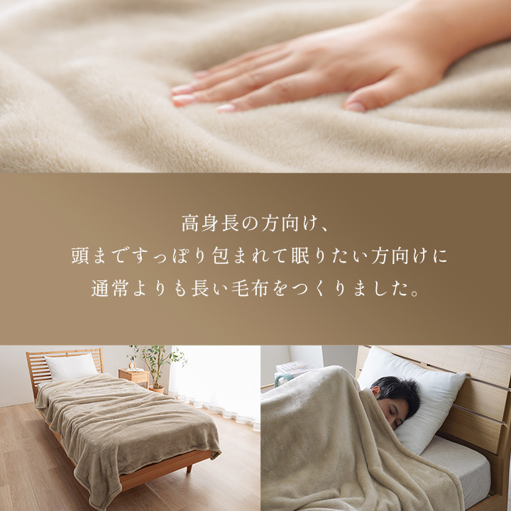 | 高身長の方向け、頭まですっぽり包まれて眠りたい方向けに通常よりも長い毛布をつくりました。 従来のシングルサイズよりも35cmの長く、高身長の方でも足がはみ出ずに快適に眠ることができます。 肌に触れる表地にはふんわりやわらかくあたたかなフランネル素材を使用しています。 洗濯機で丸洗い可能(ネット使用)で、いつでも清潔にご使用頂けます。 |