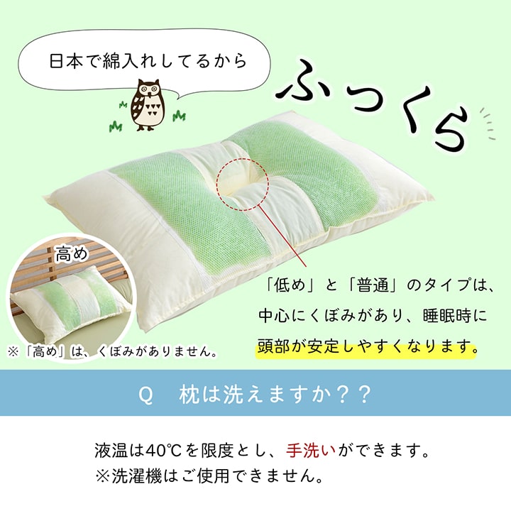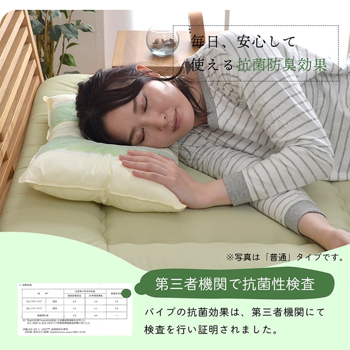 | 選べる高さが3種類。ご希望のサイズを選んで下さい。ヒバエッセンス練り込みパイプを使用しています。青森県のヒバの木から抽出した「ヒバエッセンス」をメーカー独自の技術でパイプに加工しました。ヒバエッセンスにはヒノキチオールという、天然物質としては極めて抗菌性の高い成分が含まれています。(無加工品に比べ、抗菌・防臭効果があります。)ヒバエッセンスで安らかな森の眠りをご提案します。パイプ使用のため、通気性がよく、熱がこもらず心地よくご使用できます。リバーシブルタイプでひばパイプ側、ポリエステルわた側の2種類の触感を楽しめます。※中材の出し入れはできません。 |