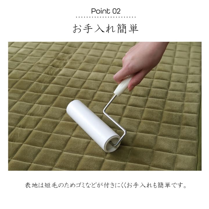| "もちもちとしたタッチ感が心地よいラグです。 ウレタンを10mm使用することで底つき感のないもっちりとしたほどよい弾力があります。 表地は短毛のためゴミなどが付きにくくお手入れも簡単です。 さらっとした肌触りで1年中ご使用いただけます。 |