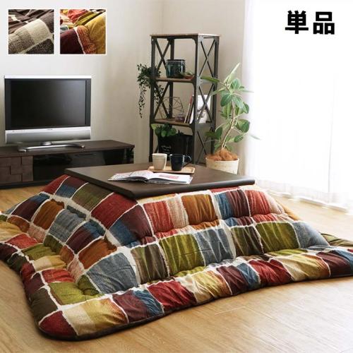 | パッチワーク風のデザインをしたこたつ布団です。国内でわた入れをしています。側地にはポリエステル素材を起毛させた柔らかい生地を使用しています。部分暖房のこたつは電気代もおトクです。 |