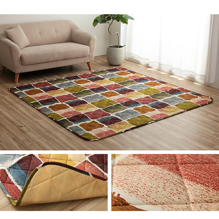 | パッチワーク風のデザインをしたこたつ布団と敷き布団のセットです。国内でわた入れをしています。側地にはポリエステル素材を起毛させた柔らかい生地を使用しています。部分暖房のこたつは電気代もおトクです。 |