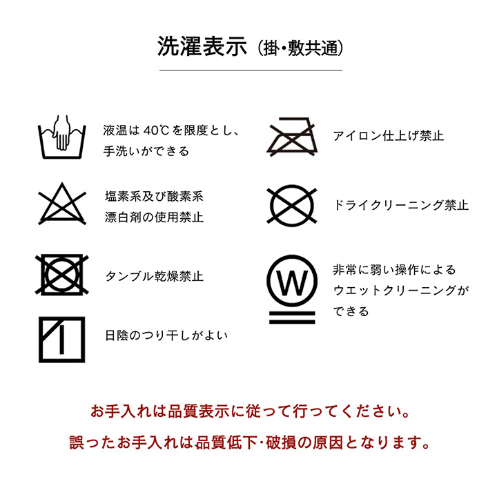 | 掛け=40℃以下の水温で弱い手洗いで洗濯してください。(洗濯機は使用できません。) 干し方=日陰のつり干しがよい。 |