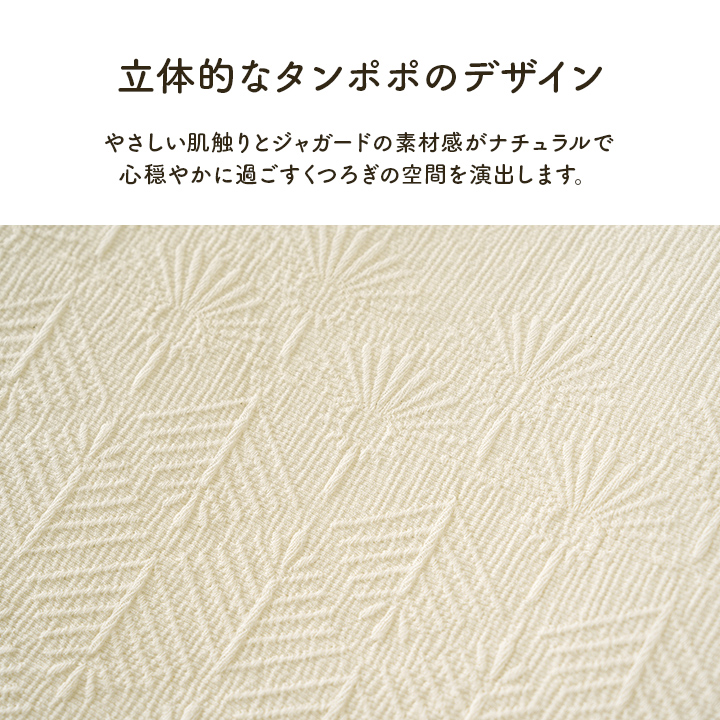 | ■日本古来の小紋柄を思わせるタンポポ柄を取り入れたジャパンディテイスト ■綿のやさしい肌触りとジャガードの素材感がナチュラルで心穏やかに過ごすくつろぎの空間を演出 ■さらっとやさしい肌触りなので一年中使える", |