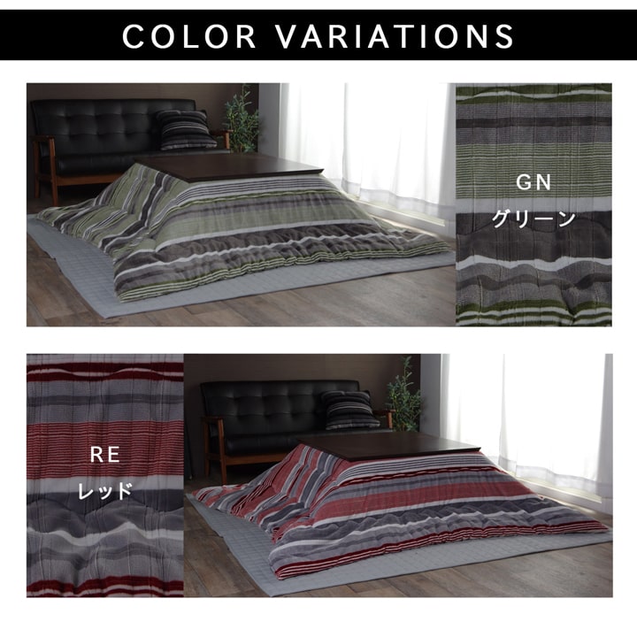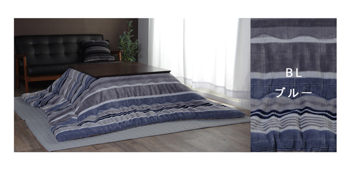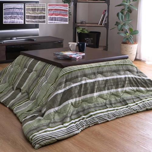 | ジャガード織の凹凸感が特徴的な素材感があるこたつ布団です。お部屋の雰囲気気を崩さない淡い色目とカジュアルでお部屋に合いやすいストライプ柄にしました。薄手なので折りたたんでもかさばらず、コンパクトに収納できます。部分暖房のコタツは電気代もおトクです。 |