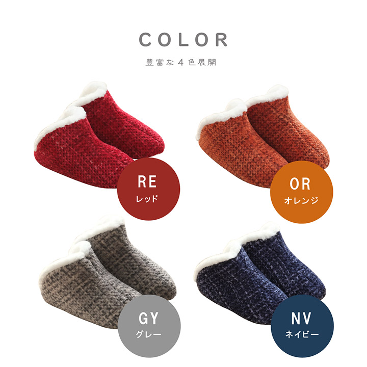 | 表地は針抜きでボコボコとした凸凹感を出し、なめらかな肌触りの珊瑚マイヤーです。あったかボア仕様で足首まで覆うため暖かく、かかとがないため脱ぎ履きがしやすいタイプです。ご自宅用、来客用、オフィス用など幅広くどのような場面でもご使用いただけます。 |