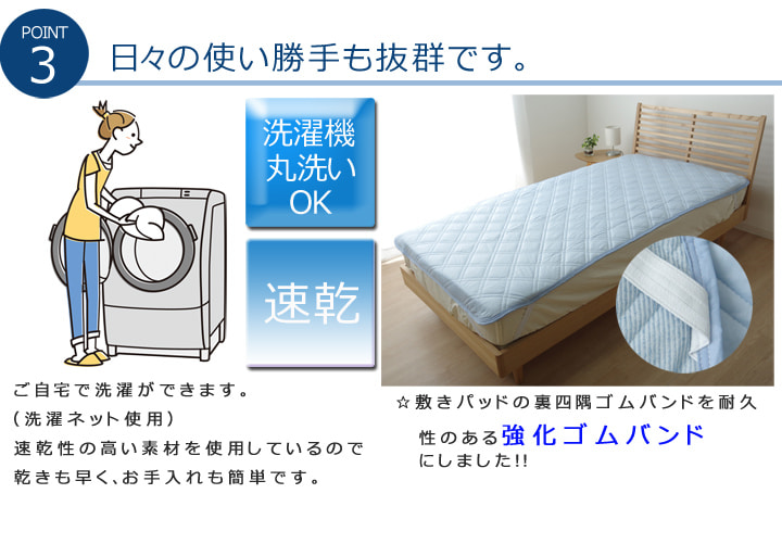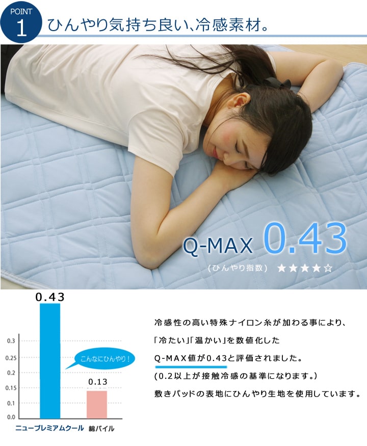 | 接触冷感・吸水速乾・消臭機能が特徴の商品です。こちらの商品は、両面使えるリバーシブル素材です。表地にはQ-MAX0.4以上の冷感素材を使用。裏面には柔らかな肌触りが特徴のソフト吸水速乾パイルを使用しています。エアコンが苦手な方でも快適に。節電、節約にもつながる商品です。ズレにくいよう四隅にはゴムバンド付きです。洗濯機で丸洗いが可能なので、いつでも清潔にご使用頂けます。 |