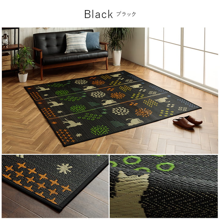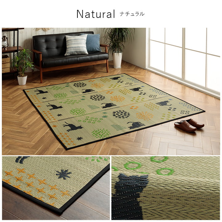 | "大人気!ネコのシルエットデザインのい草ラグです。 ブラックカラーでモダンシックにキメてもよし、ナチュラルカラーで涼しげにコーディネートしてもいいデザインです。 コンパクトに三つ折りで畳めて省スペースにも収納できます。 い草には空気の清浄作用、湿度の調整作用があり、汚れにくいといった特徴があります。敷くだけでお部屋をリフレッシュできます。 和モダンなデザインがどんなお部屋にも合わせやすいい草ラグです。 通常のい草ラグに比べ、1.2倍のい草を贅沢に使用していますので、繊細なデザインに加え、耐久性もアップ。 おしゃれなデザインを長くご愛用頂けます。 い草には空気の清浄作用、湿度の調整作用があり、汚れにくいといった特徴があります。敷くだけでお部屋をリフレッシュできます。 青森県のヒバの木から抽出した「ヒバエッセンス」をメーカー独自の技術で生地表面に加工しました。 ヒバエッセンスにはヒノキチオールという天然物質が含まれており、抗菌防臭効果があります。 裏は滑り止め不織布ですので、安心してご使用頂けます。 |