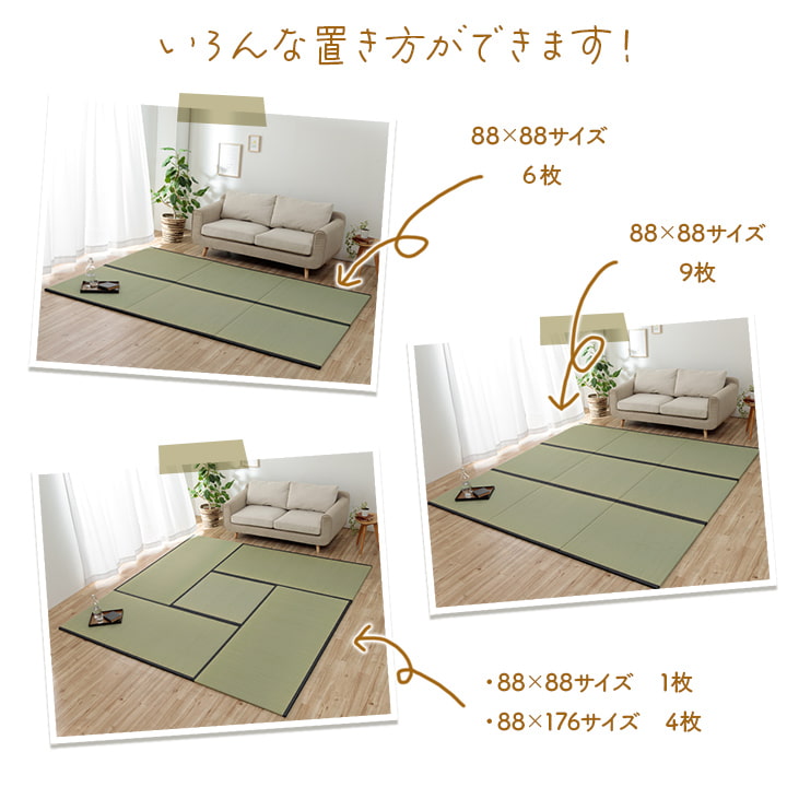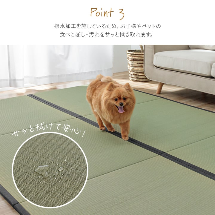 | "撥水加工のある本格い草置き畳です。 表生地には国産のい草を使用しています。一本一本が太く、表皮が厚く、繊維がキメ細かいので弾力性があり、耐久性に優れています。 い草には空気の自然浄化作用、湿度の調節作用などがあります。また汚れにくく、使用するうちに黄金色に変化し、味が出ます。 撥水加工を施しているため、お子様やペットの食べこぼし・汚れをサッと拭き取れます。 中材に木製ボードを使用した重量感のある本格タイプです。また、ウレタンを挟むことでクッション性もプラスしました。 裏の不織布にはすべり止め加工を施しています。 |