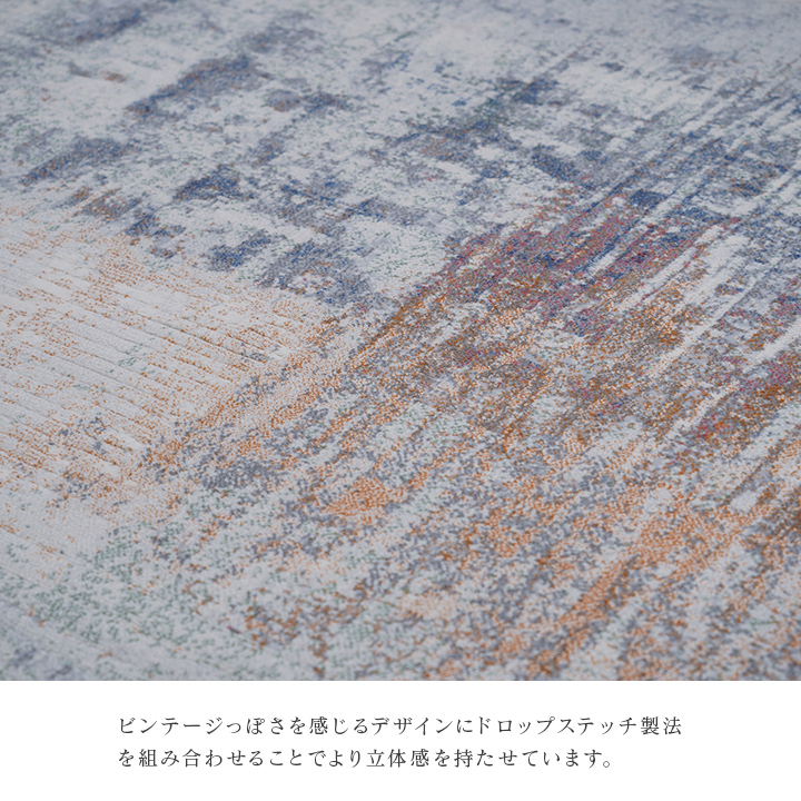 | "斬新なデザインが特徴的で様々なお部屋にも合わせやすいアブストラクト柄のウィルトンラグ。 ビンテージっぽさを感じるデザインにドロップステッチ製法を組み合わせることでより立体感を持たせています。 複数のカラーが入り混じって見えるデザインは、高見え効果もあります。 ノット数が500,000ノットと高いため、高密度でしっかりした踏み心地です。 パイルの長さも11mmと長く、重厚感のある仕上がりになっております。 緯糸にはジュート糸が使われており、抗菌防臭・消臭効果もあります。 汚れが付着しにくく、遊び毛や毛玉が出にくいという特徴のポリプロピレン糸を使用しています。 ホットカーペットカバーや床暖房にも対応しております。 (ラグに厚みがある場合・ラグの密度が高い場合は、熱が伝わりにくくなる場合がございます。) ※掲載写真は表記サイズと異なる場合がございます。 |