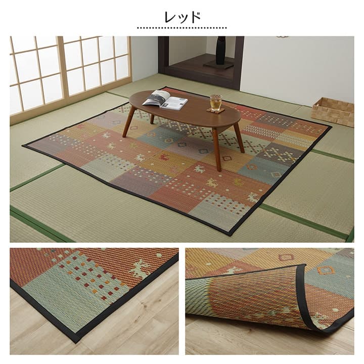 | ギャベ柄で明るいデザインに仕上げたい草花ござカーペットです。 和室・洋室どちらにも合わせやすいデザインに仕上げました。和室には裏張り無しの商品、洋室には裏張り有りの商品がお勧めです。天然素材のい草には、お部屋の空気をきれいにする空気清浄効果、お部屋の湿度を調整する調湿効果、汗臭、加齢臭、ペット臭などの嫌な臭いを消臭する消臭効果など優れた機能性があります。 青森県のヒバの木から抽出した「ヒバエッセンス」をメーカー独自の技術で生地表面に加工しました。ヒバエッセンスにはヒノキチオールという、天然物質としては極めて抗菌性の高い成分が含まれています。(無加工品に比べ、抗菌防臭効果があります。) |
