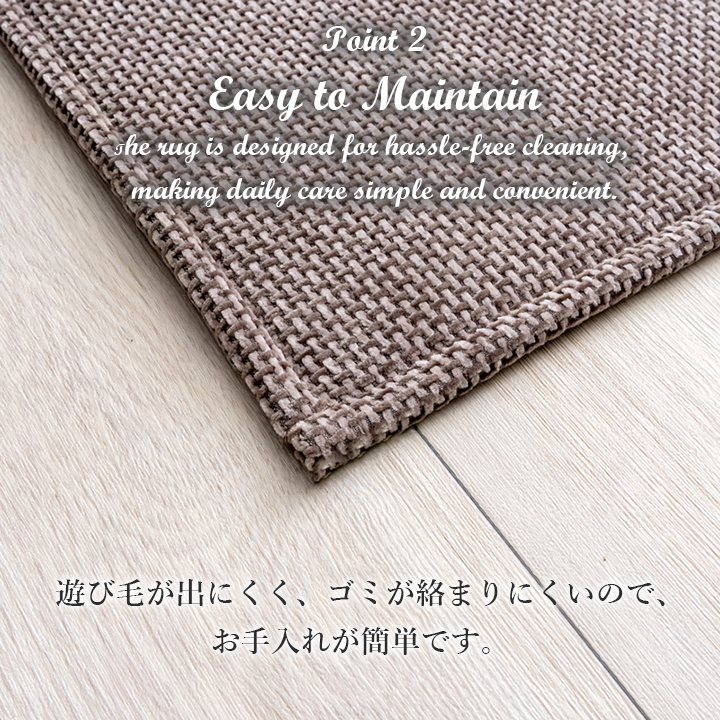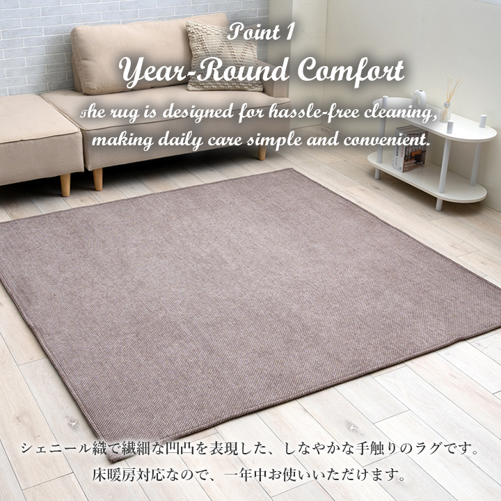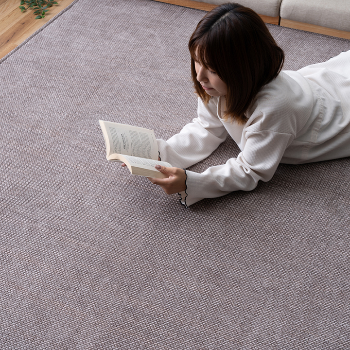 | シェニール織で繊細な凹凸を表現した、しなやかな手触りのラグです。 床暖房対応なので、一年中お使いいただけます。 遊び毛が出にくく、ゴミが絡まりにくいので、お手入れが簡単です。 万一汚れても手洗いができるのも嬉しいポイント。 中材にウレタン7mmを使用しているため、程よいクッション性があります。 コンパクトに折り畳めるため収納にも場所を取りません。 軽量なので女性でも簡単に持ち運べます。 ホルムアルデヒド試験の乳幼児用品基準をクリア。小さなお子様にも安心して使えるノンホルムアルデヒド製品です。 裏面は滑りにくい加工を施し、ズレによるストレスを軽減。 |