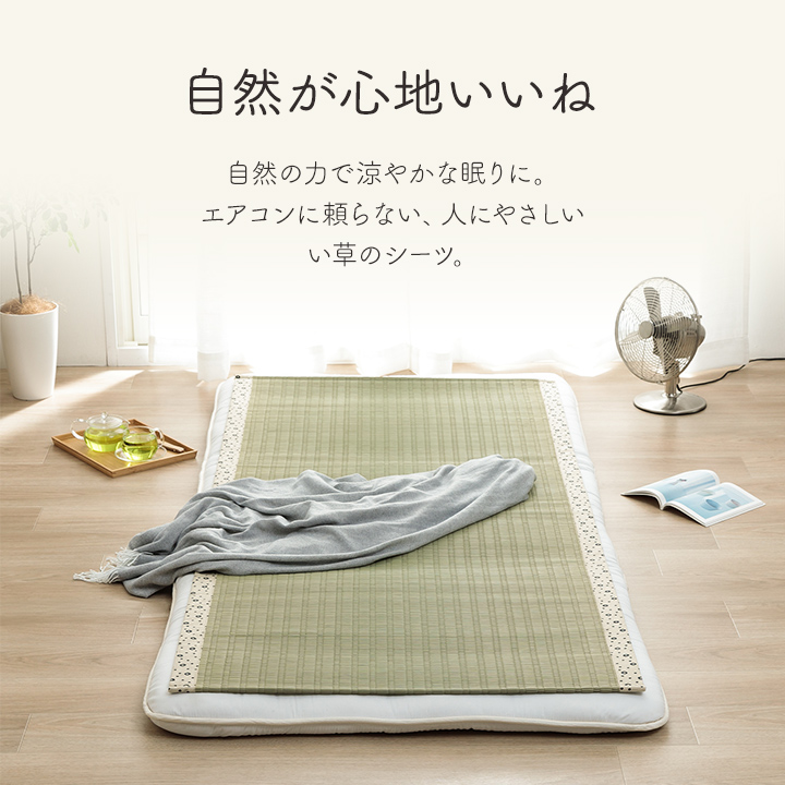 | ■熊本県八代産の国産い草を使用したい草シーツ(寝ござ)です。 ■国産い草は一本一本が太く、表皮が厚く繊維がキメ細かいので、弾力性があり、耐久性に優れています。 ■い草には吸湿力・調湿効果があり、汗を吸収してさらっと快適な睡眠をサポートします。 ■快眠い草の効能として 1.綿の約2.5倍の吸湿力 2.蒸れにくい。汗による湿気を吸うことにより温度を下げ快適な就寝を促します。 3.汗のにおいを軽減。汗のにおいの元となる化学物質を91%以上抑えます。 などがあります。暑苦しい日本の夏でも汗のジメジメを軽減してくれます。 |