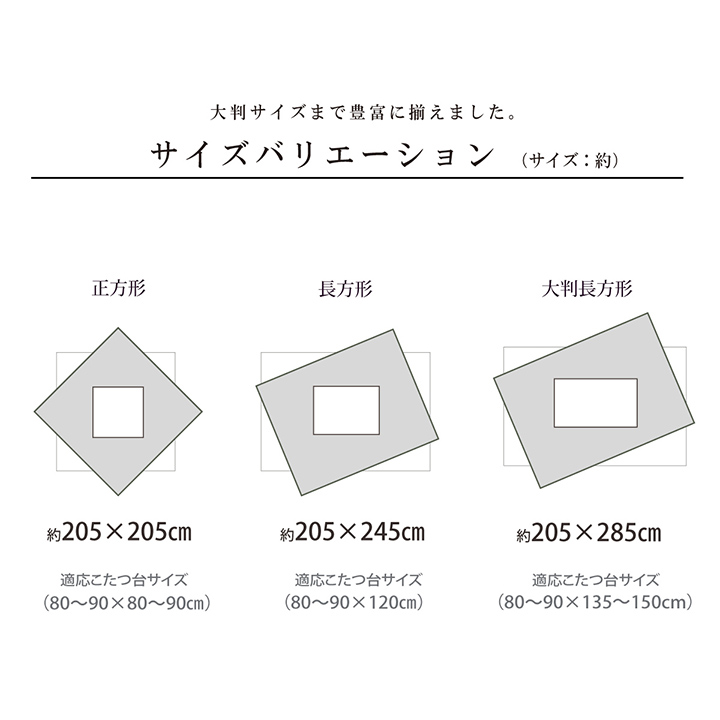 | "伝統の市松柄をモダンにアレンジしたこたつ布団。 細かな起毛を施して桃の肌のように柔らかに仕上げた「ピーチスキン」加工の生地を使用しています。 中綿には弾力性に優れた「東レマッシュロン?」を使用しています。 繊維の中心が空洞になっており、暖かい空気を含んで逃がしません。 裏地には柔らかく肌触りの良いフランネル生地を使用しています。 ※掲載写真は表記サイズと異なる場合がございます。 ※ふとんをやぐらの中に押し込んだり、座イスやイス全体をこたつの中に入れたまま使用しないでください。ふとんがヒーターに当たらないようにご使用ください。(火災の原因になります)ご使用により、ふとんが焦げた場合につきましては、返品・交換を承ることができませんので、あらかじめご了承ください。 ※画面上のカラーはご使用ブラウザやモニターの設定により、実物とは若干異なる場合がございます。あらかじめご了承の上、ご注文をお願いいたします。 |