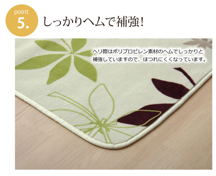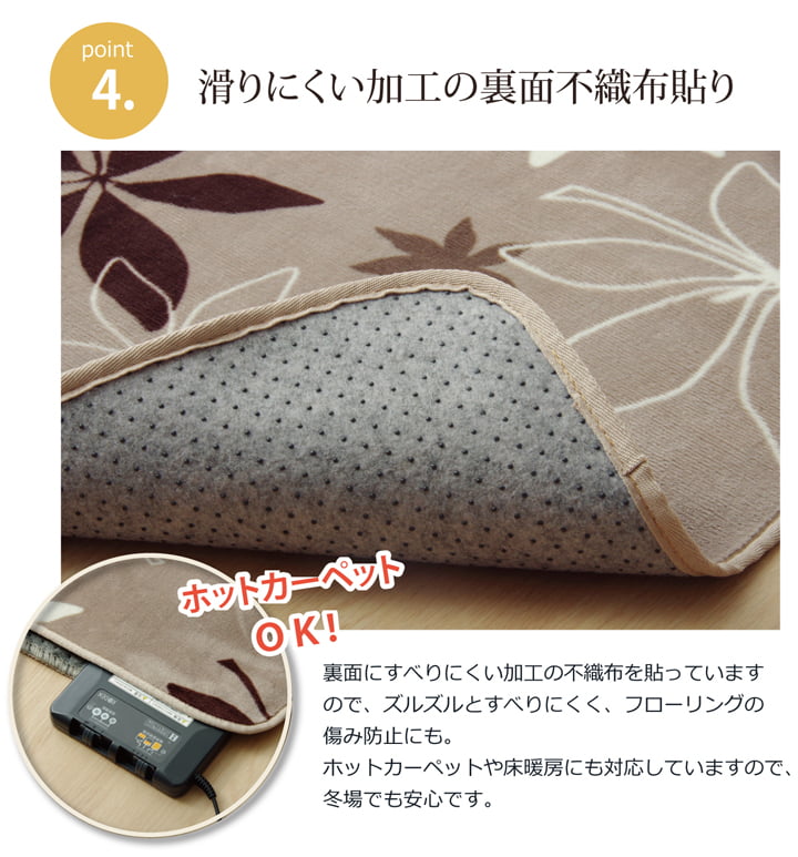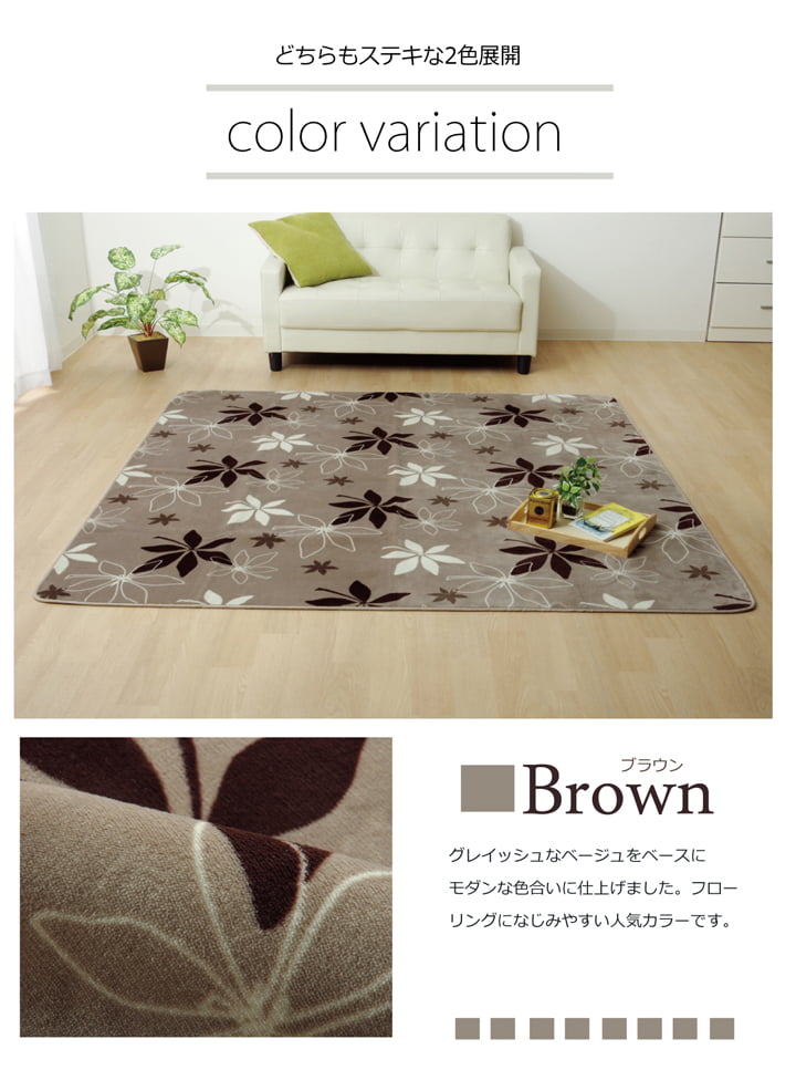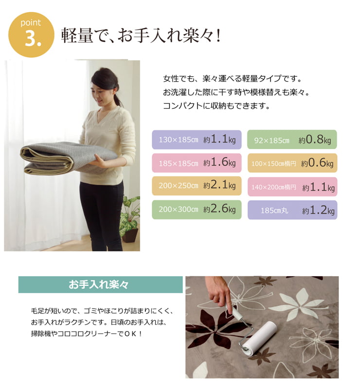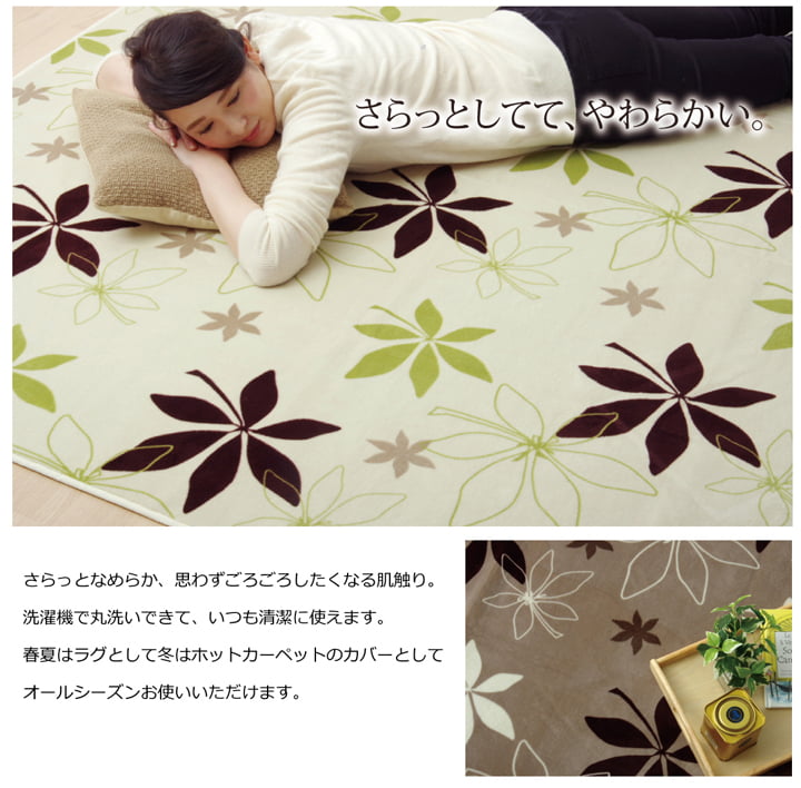 | 生地に抗菌・防臭加工を施した、ラグカーペットです。表地にはフランネルと呼ばれる、しっとりとして非常に柔らかい生地を使用しています。軽量で持ち運びが楽々です。薄手で小さく折りたたむことができますので、収納時にも場所を取りません。フローリングを傷つけにくいよう、裏には不織布を貼っています。ご家庭の洗濯機で洗えるウォッシャブル仕様ですので、清潔にご使用頂けます。電気カーペットカバーとしてもご使用頂けます。季節を選ばすオールシーズンご使用頂けます。多サイズ展開で、ワンルームから子ども部屋、リビング・ダイニング、ベッドサイド、ソファ前にも。いろいろなシーンに合わせてお選び下さい。 |