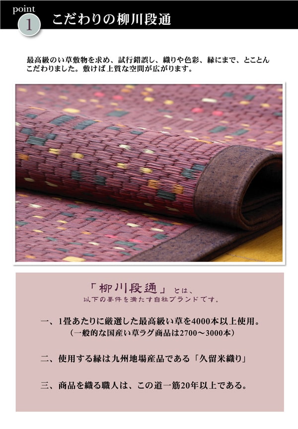 | 『柳川段通』シリーズのイ草カーペットです。柳川段通の特長として(1)厳選したイ草を通常の商品よりも約1.4倍(メーカー比)使用しています。(2)ヘリ生地は久留米織りの生地を使用しています。久留米織りとは福岡県久留米地方の伝統的な織りもので、着物や洋服によく使われている貴重な織りものです。(3)本商品の織り職人はこの道一筋20年~40年の熟練の匠です。国産(九州産)のい草を使用しています。一本一本が太く、表皮が厚く繊維がキメ細かいので弾力性があり、耐久性に優れています。い草には空気の自然浄化作用、湿度の調節作用などがあります。また汚れにくく、使用するうちに黄金色に変化し味が出ます。い草に青森ヒバ加工を施しています。(抗菌、防臭効果) |