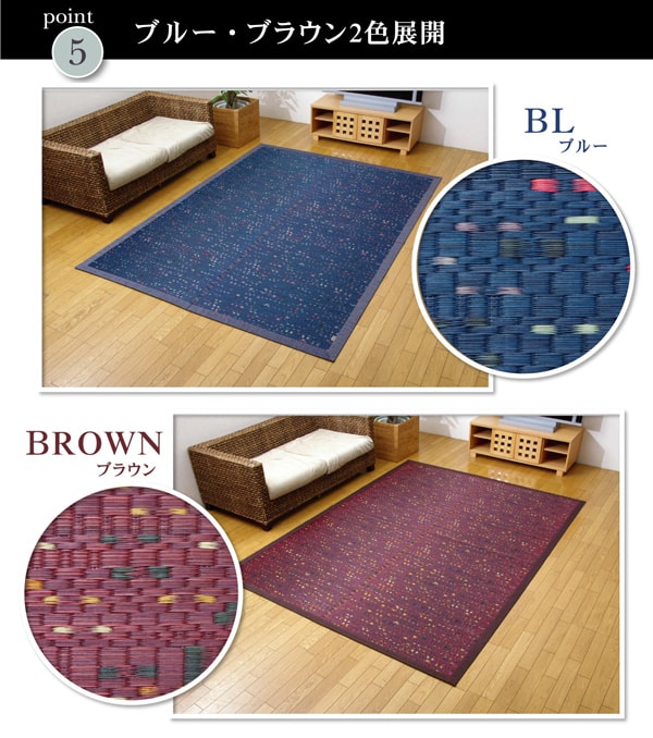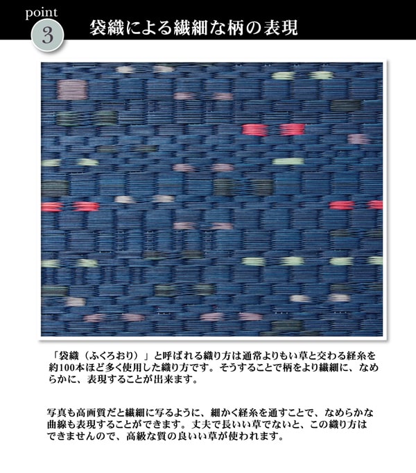 | 表地=い草 ※紋織、三重織 ヘリ=綿100%(久留米織り) |