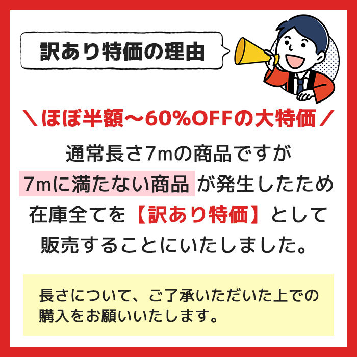 本来、長さ7mの商品ですが、7mに満たない商品が発生したため、アウトレット価格で販売いたします!